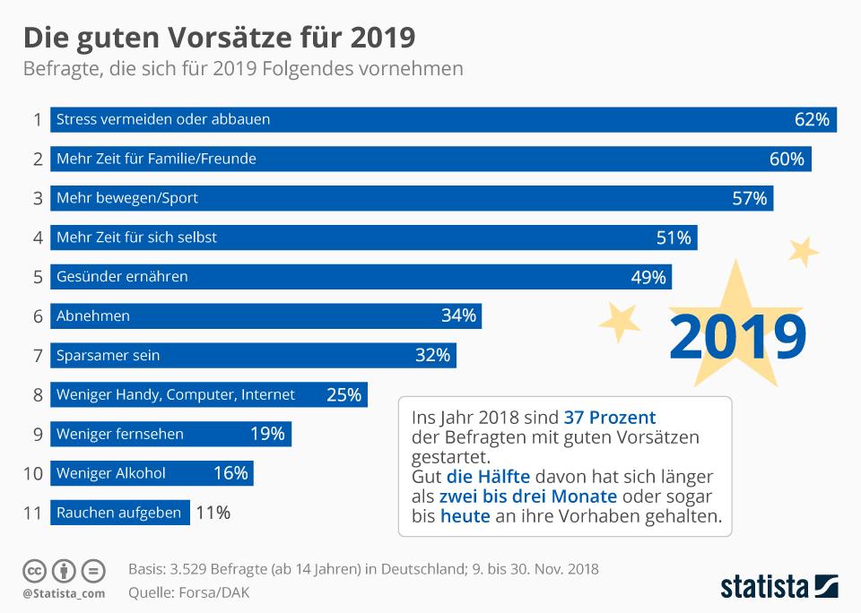 Auf der Liste der guten Vorsätze für 2019 steht bei den Deutschen das Ziel, Abzunehmen, immerhin auf Platz sechs.